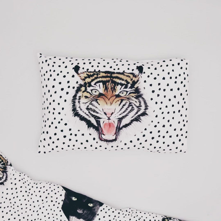 This cool, modern and unique Wildcats Cot Bedding Set print features big cats roaring against a monochrome animal spot background. Discover tigers, lynx, jaguars, cheetahs and snow leopards within the print. It’s unisex, and perfect for a wild child’s bedroom!